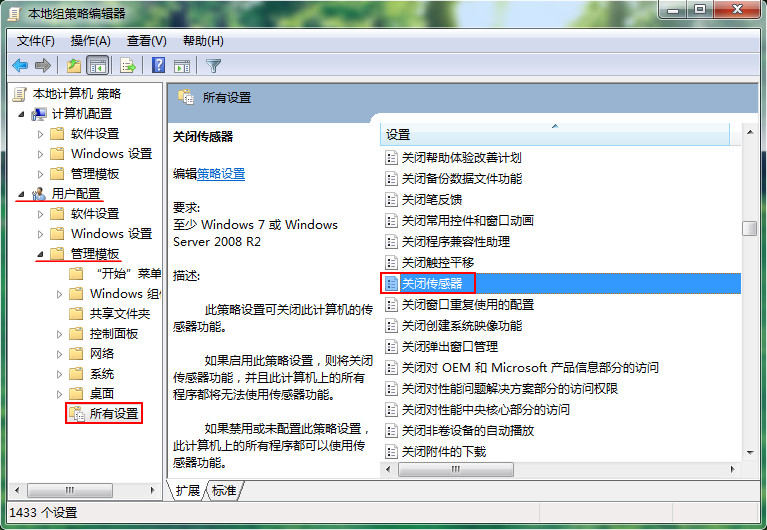 3、進(jìn)入本地組策略編輯器,依次進(jìn)行展開“用戶配置——管理模板——所有設(shè)置”文件夾,然后在右側(cè)窗口找到并雙擊“關(guān)閉傳感器”選項(xiàng),如圖所示: